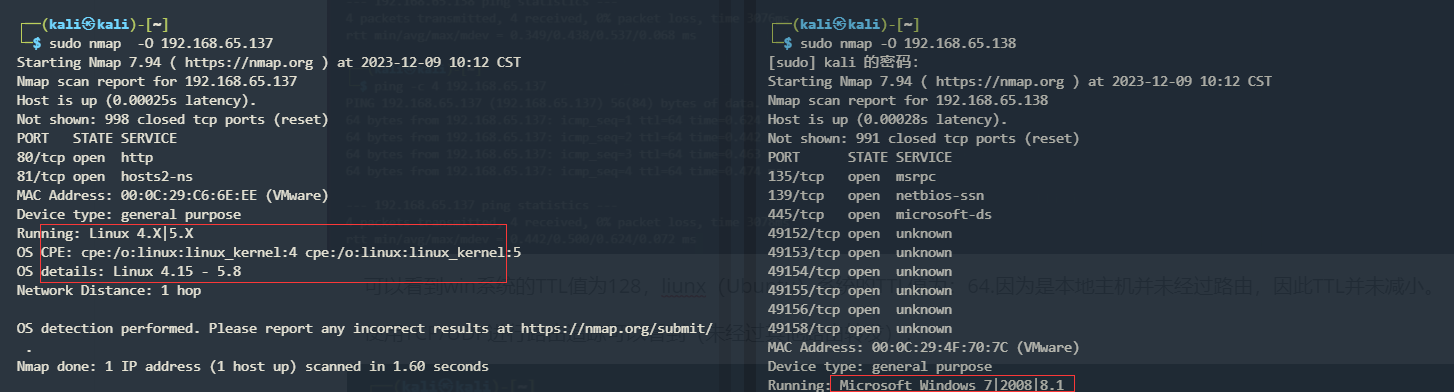 例如我们可以通过ping命令观测TLL值得大小来是否为windows和liunx系统。亦可以使用nmap扫描指定好参数就可以探别系统版本和信息。